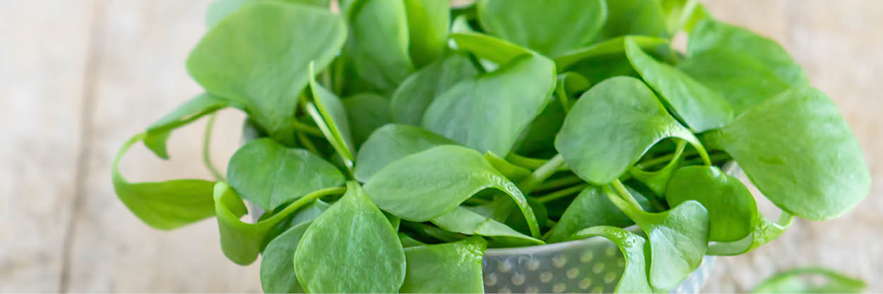 Winterportulak (Claytonia perfoliata) wird auch als Tellerkraut oder Kubaspinat bezeichnet. Er ist eine einjährige Pflanze mit einer Wuchshöhe von rund 20cm. Er bildet zunächst rautenartige Blätter. Im Frühjahr bildet er dann unter den Blüten größere „tellerförmige“ Blätter aus. Sowohl die kleinen wie auch die großen Blätter und die Blüten des Winterportulak sind essbar. Er hat einen leicht nussigen bis erdigen Geschmack, der auch etwas säuerlich sein kann. Er enthält viel Vitamin C in seinen Blättern.